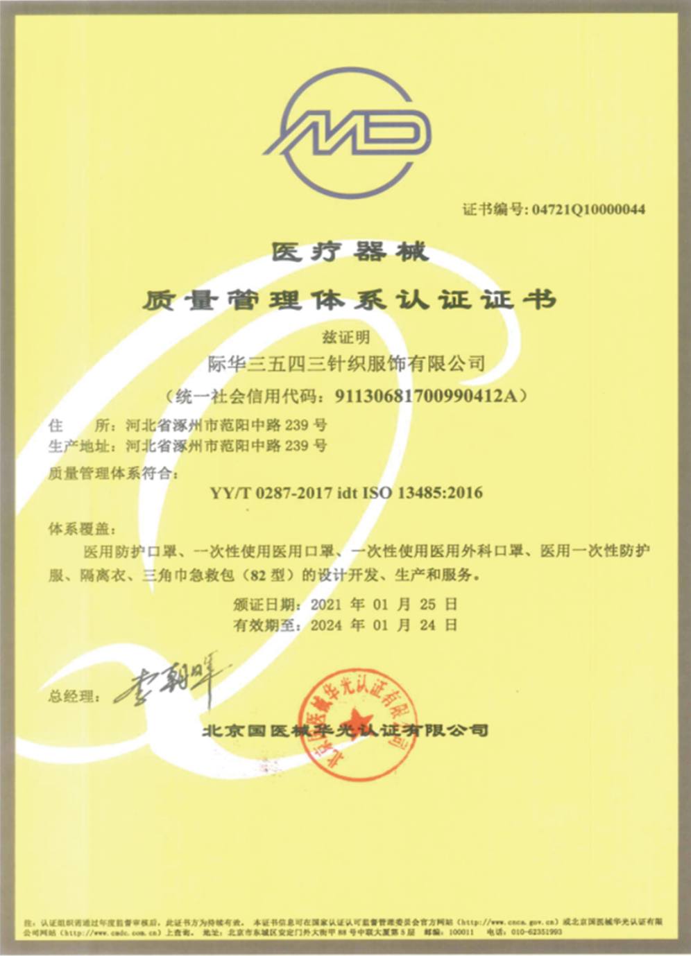 醫療器械質量管理體系認證證書